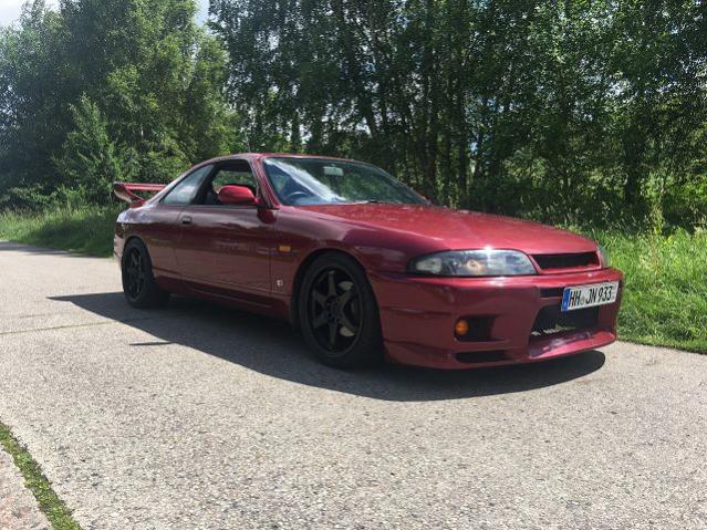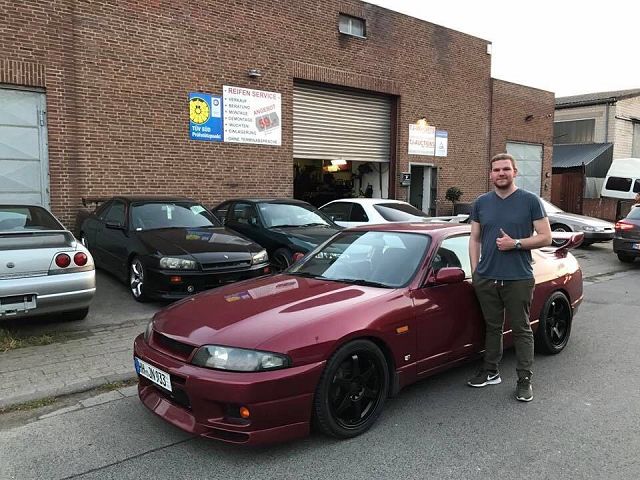 einen 1994er Skyline R33 GTS-T in Weinrot mit RB25DET und manuellem Getriebe.