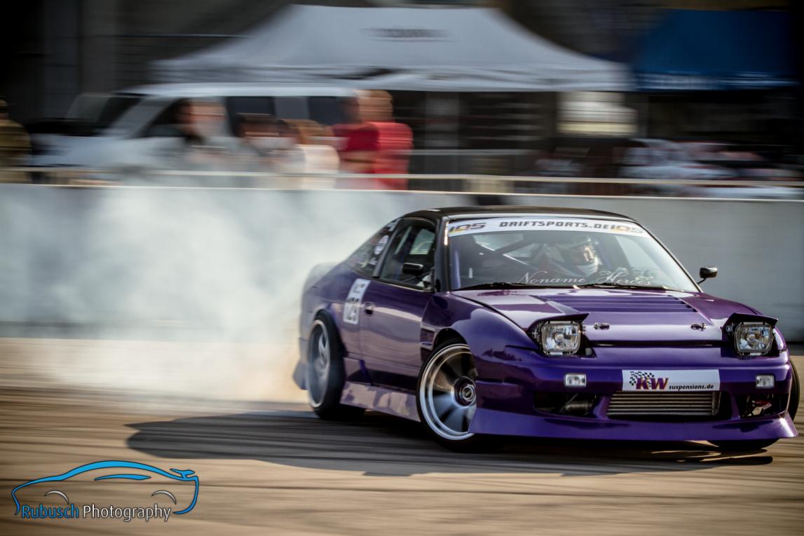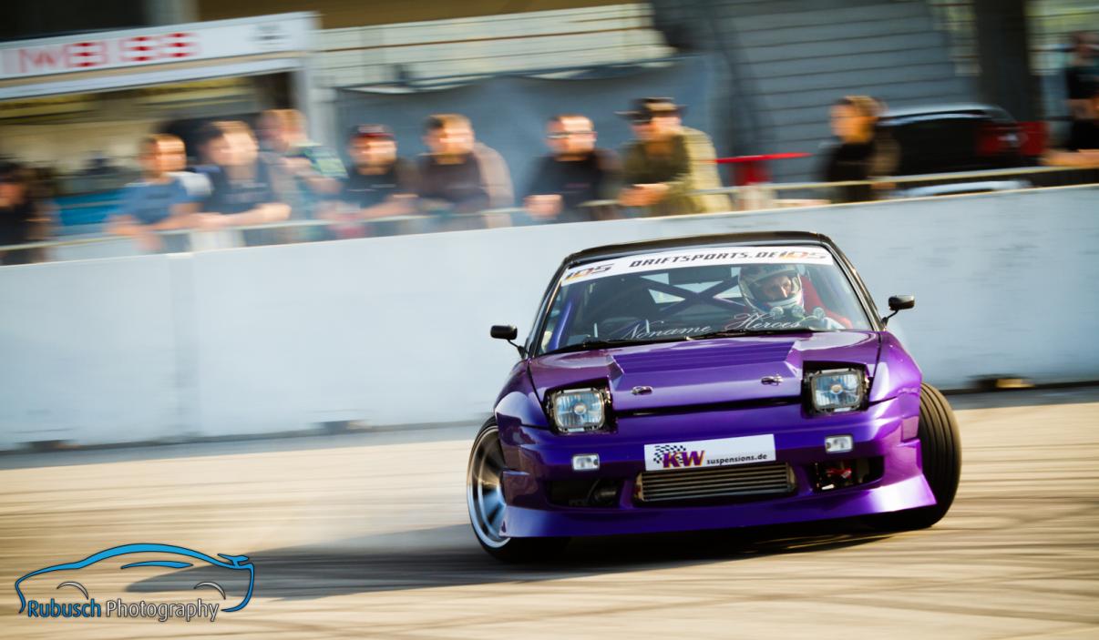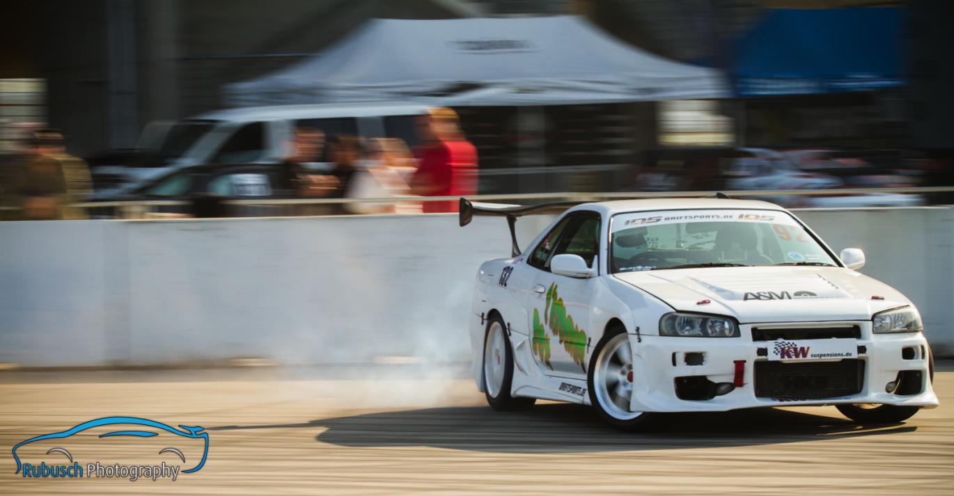 Grund zur besonderen Freude bei den Zuschauern, aber auch bei sich selbst, hatte Denise Ritzmann. Sie darf sich als erste Frau auf einem IDS Podest in die Annalen des deutschen Driftsport eintragen. Ganz überraschend war es nicht; so war sie bereits bei mehreren Events mit forderen erfolgreichen Plätzen aufgefallen und hatte sogar zwischenzeitlich die Gesamtliste in der PRO-Wertung angeführt. Ein KW-Gutschein in Höhe von 1.000,- € waren der Lohn für ihren unermütlichen Einsatz und ihre tollen Fahrleistungen, die sich von Jahr zu Jahr enorm gesteigert hatten. Auch sie empfiehlt sich bereits für 2015, zumal sie es sicherlich noch ihrem Bruder Patrick, der in 2012 den Meistertitel gewinnen konnte, gleich tun möchte.In der Streetklasse war es noch nicht final entschieden. Zwar musste Jörg Stoll nur noch 2 Punkte einsammeln und dann hätte er seinen größten Rivalen Wolfgang Rühl geschlagen, jedoch wusste man auch, dass gerade am Hockenheimring mit der langgezogenen schnellen Mauer, ein kleines Maleur mal schnell zum Ausfall und somit zum Verlust der kompletten Meisterschaft führen kann. Aus diesem Grund konnte es Jörg nicht ganz so locker angehen, was man sogleich auch bei seinem ersten Wertungslauf erkennen konnte. Der sonst so präzise Fahrer produzierte gleich im ersten Lauf einen Dreher und die Anspannung in den Gesichtern aller Teammitglieder war sichtlich zu erkennen. Ein Sicherheitslauf im zweiten Durchgang brachten allerdings dann die heiss ersehnten Punkte, da dieser sicher für die TOP16 reichen sollte.