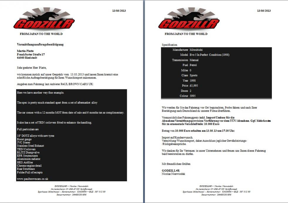 Also ganz ehrlich,... bei dem Vertrag wäre ich auch stutzig geworden.Zitat von dA_Chrizz Beitrag anzeigenDer Vertrag ist ja mal mehr als schwammig und lässt dem Importeur ziemlich freie Hand. Da wäre ich schon bei der Unterschrift stutzig geworden.