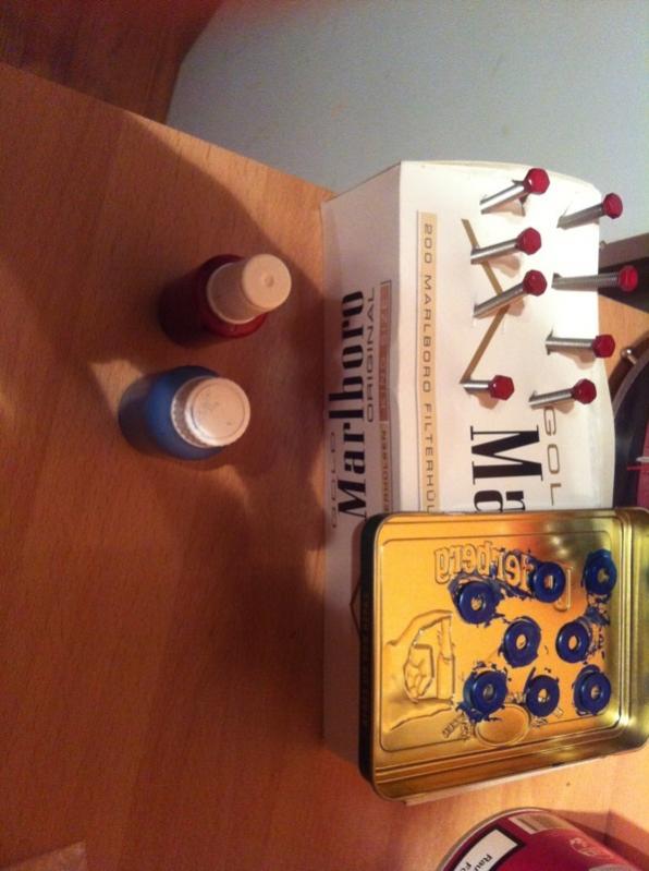 Die Schrauben sind in der Motor Farbe lackiert und die beilagscheiben in Wagenfarbe.