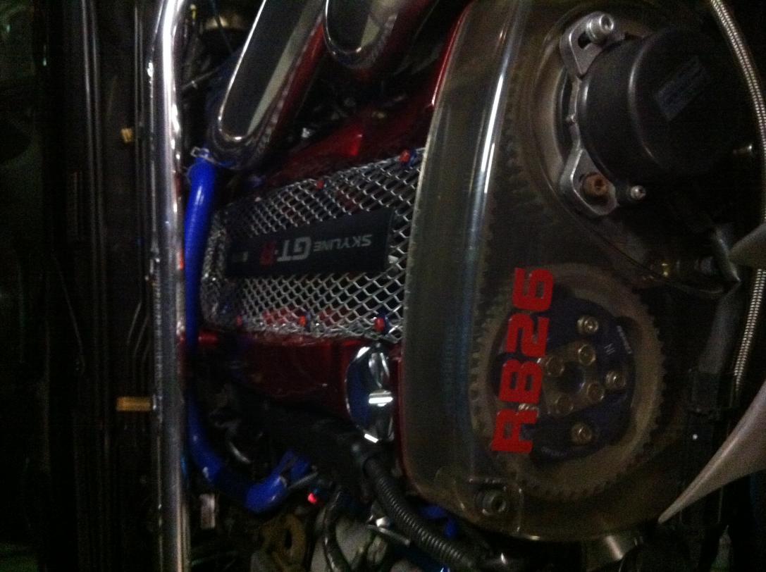Auf der Klarglas zahnriehmen Abdeckung den hervohrgehobenen rb26 schrifzug lackiert in motorfarbe.