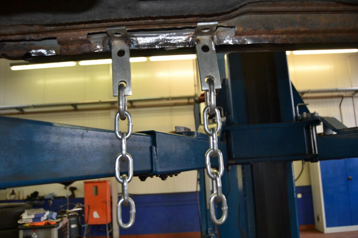 Dies wurde mit dem Anschweißen von Motorhaltern und einem 1 Tonnen Flaschenzug realisiert ... der hier auch schon an seine Belastungsgrenze kam. ;-)
