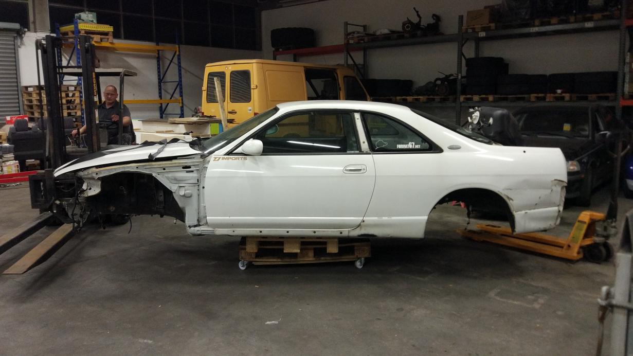 Ich erwarb also, um genau zu sein, vor einer Woche einen komplett zerlegten und verunfallten R33 GTST S2 mit einer weiteren Karosse. Alles auf den Trailer geladen, 2 mal gefahren und jetzt steht der Krämpel in Gitterboxen und in 2 Hallen verteilt ^^