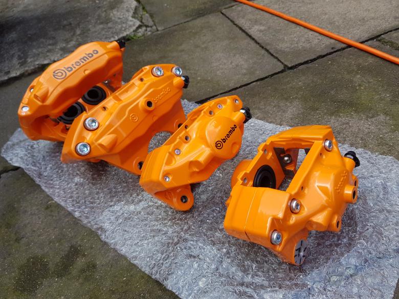 Die Sättelhälften wurden zerlegt, alle Dichtungen erneuert und alle Schrauben gegen neue, verzinkte getauscht. Anschließend ließ ich die Sättel in Orange pulvern, die Akzentfarbe für die ich mich beim Sky entschieden hatte. Das Ergebnis ließ sich sehen: