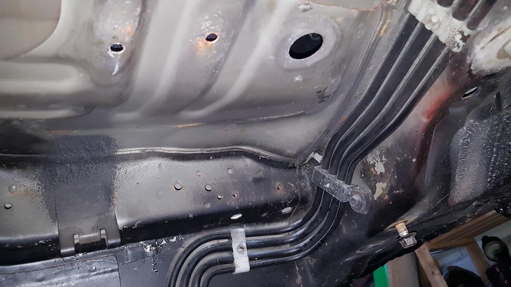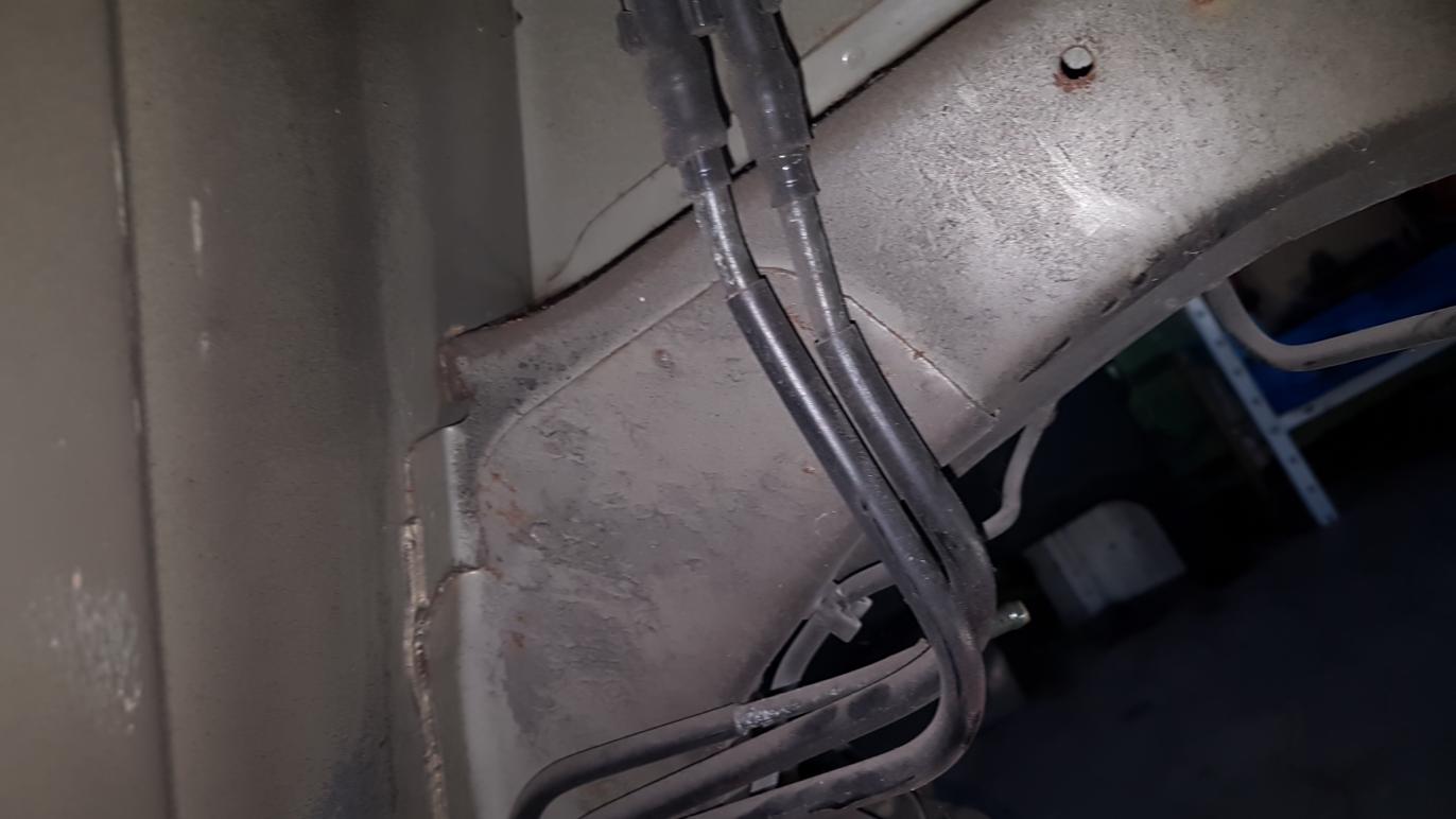 Der Unterboden hinter dem Tank sieht sehr gut aus. Punktuell, besonders an den Blechenden, ist leichter Rostansatz. Ist also alles mit etwas Arbeit leicht zu beheben.