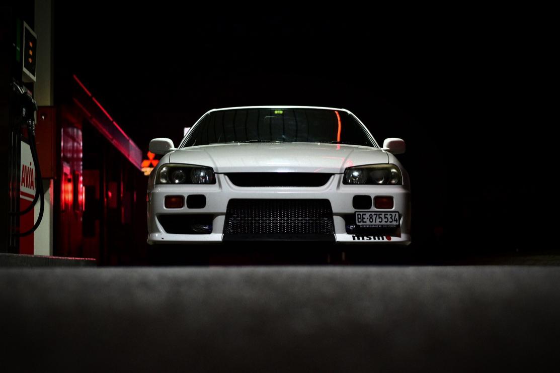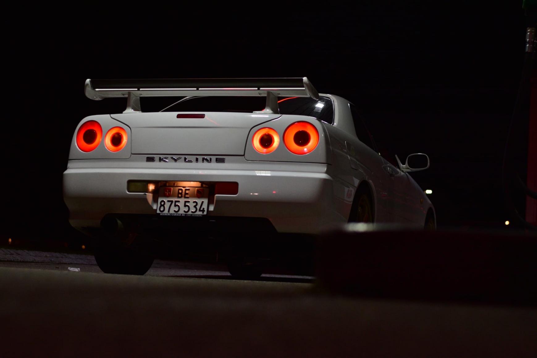 Ein 1998er R34 GTT mit Nismo Bodykit (ohne Spoiler) und GTR Spoiler. Der Lack ist Original und die Steinschläge an der Front könnten aus Yokohama stammen.
