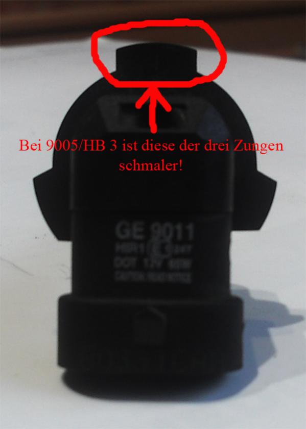 Und zwar handelt es sich hier darum, dass eine der drei Zungen (Im Bild markiert) an der Kunststofffassung der 9005/HB 3 schmaler ist als die bei unseren 9011/HIR1.