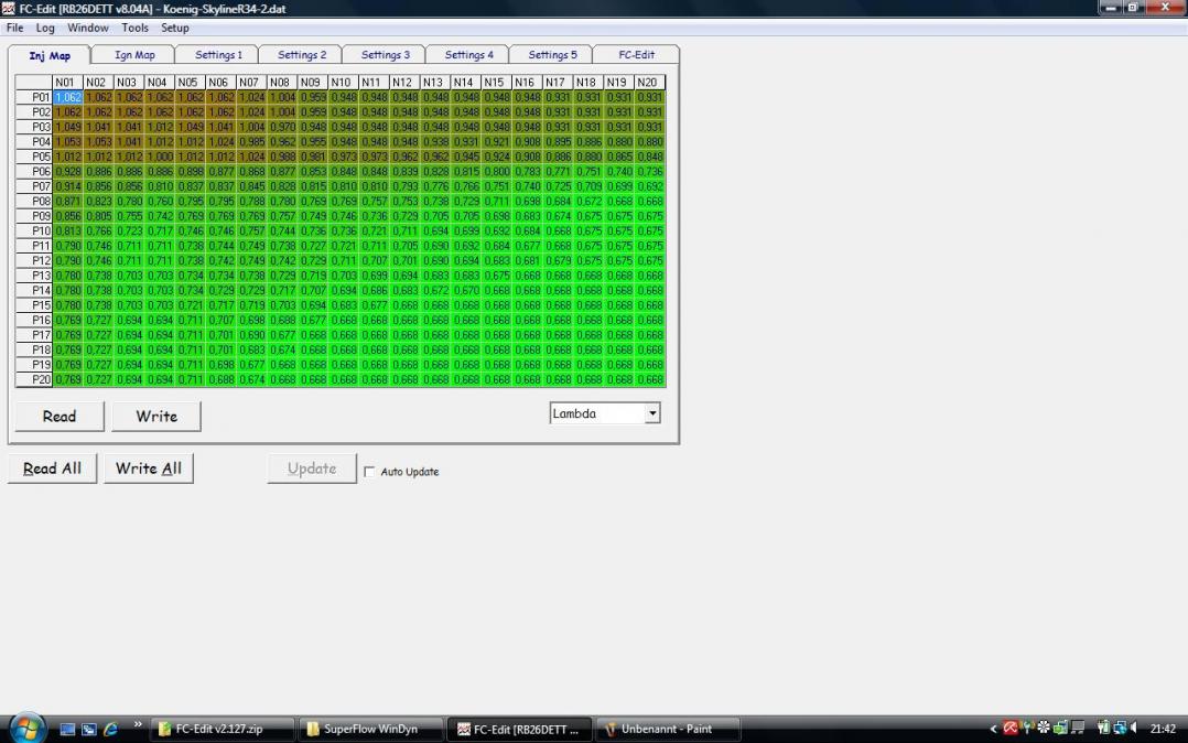 Fetter als 10,5 würde ic hden nicht stellen, ich hab bei mein RB26 fest gestellt das unter 11,5 das drehmoment stark spürbahr einbricht, ob es bei dir auf grund von zu hoher EGT oder Klopfneigung nötig ist so stark an zu fetten weis ich natürlich nicht aber wenn da ein problem vorliegt solte evtl. am Motorsetup was geändert werden.